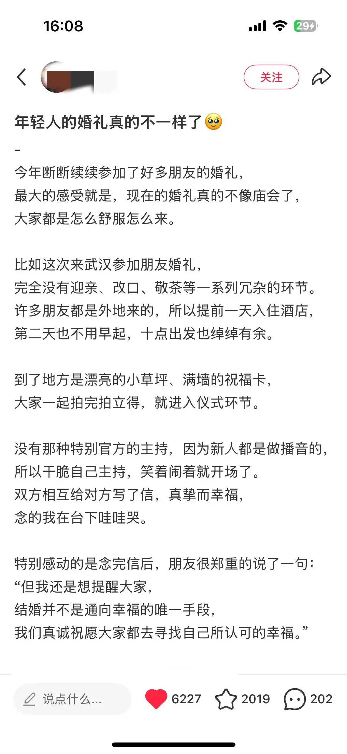 综合来看,从一场7000元的极简婚礼,到宴席酒水从“白红配”向“白+低”的组合迭代,背后是同一代际群体消费价值观的外化表达。婚礼流程的去冗余化与消费选择的实用化,共同指向年轻群体对“体验权重”的重新评估——他们愿意为真正在乎的部分(如个性化定制、情感表达、生活品质)投入更多,而对那些仅服务于“他人凝视”的面子工程则果断舍弃。这种消费理性并非对仪式感的否定,而是对仪式内核的重新校准:让婚礼回归到两个人在至亲好友见证下许下承诺的本来意义,从容享受属于自己的重要时刻。举报/反馈